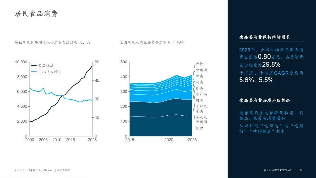 2023年,我国居平易近人均食物烟酒消费收入达0。80万元,占总消费收入比沉为29。8%,十三五、十四五CAGR别离为5。6%、5。5%。取此同时,陪伴消费布局快速升级,消费不雅念、糊口体例、饮食习惯等发生变化,食物类消费质量不竭提高。