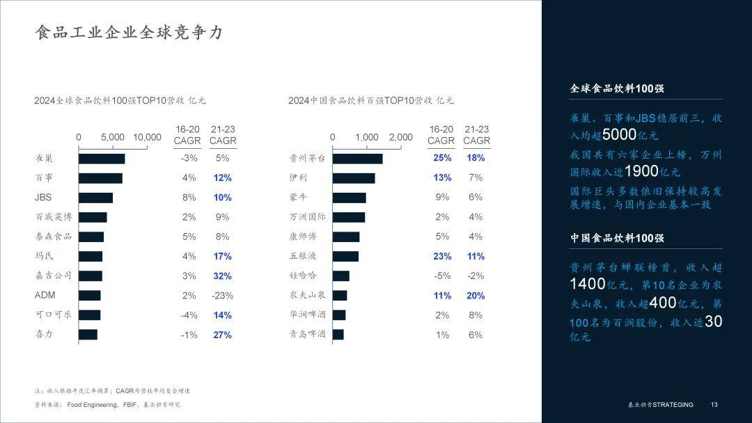 食物工业企业总体上仍偏小、弱、散,按照FBIF发布的2024中国食物饮料百强榜,贵州茅台连任榜首,收入超1400亿元,第10名企业为农夫山泉,第100名为百润股份,收入近30亿元。按照Food Engineering发布的2024全球食物饮料100强年度榜单,雀巢、百事和JBS稳居前三,食物收入均超5000亿元;我国共有6家企业上榜,别离为万洲国际、贵州茅台、同一集团、伊利集团、蒙牛、五粮液,万州国际收入近1900亿元;国际巨头凭仗强大的研发和立异、多元化的品牌组合、普遍的市场笼盖、屡次的本钱运做持续巩固市场从导地位,且大都照旧连结较高成长增速,取国内企业增速根基分歧。取国际巨头比拟,中国头部食物企业正在规模体量、国际化程度、本钱运做程度上有较大提拔空间。