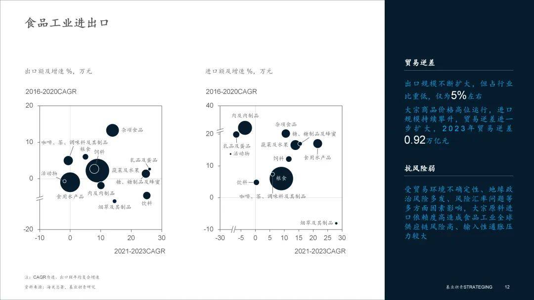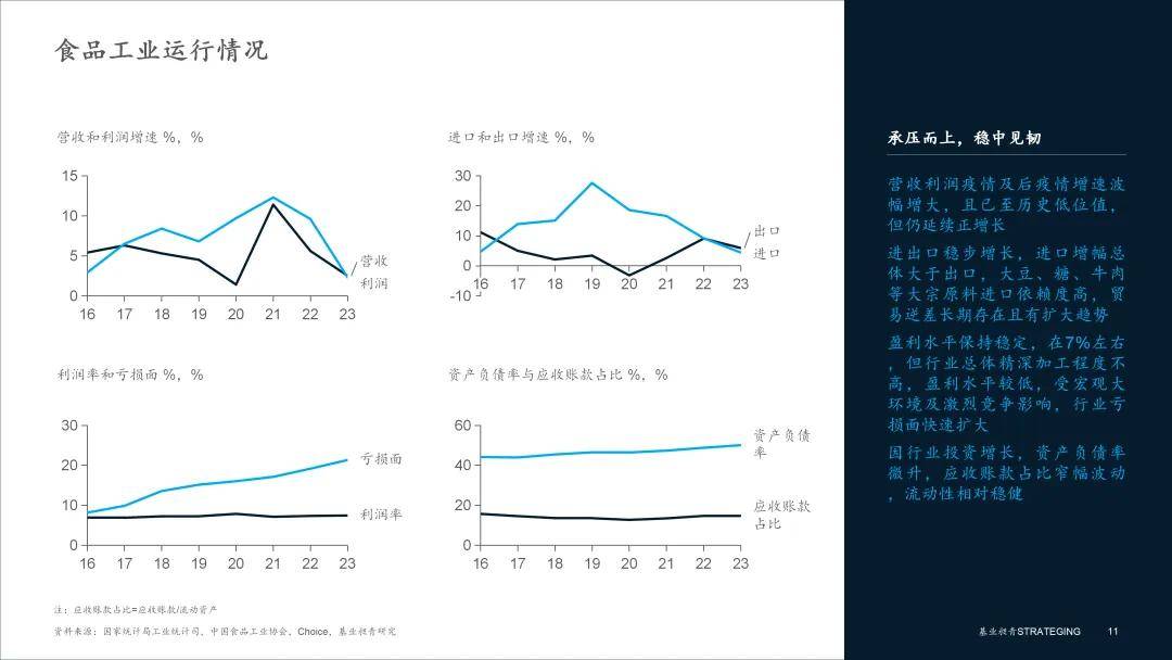 正在宏不雅经济面对需求收缩、供给冲击、预期转弱三沉压力布景下,食物工业各项运转目标较着承压,但总体呈现承压而上,稳中见韧。具体来看,营收利润疫情及后疫情增速波幅增大,且已至汗青低位值,但仍延续正增加;进出口稳步增加,进口增幅总体大于出口,大豆、糖、牛肉等大原料进口依赖度高,商业逆差持久存正在且有扩大趋向;盈利程度连结不变,正在7%摆布,但行业总体精湛加工程度不高,盈利程度较低,受宏不雅大及激烈合作影响,行业吃亏面快速扩大,自2019年15%扩至2023年21%;因行业投资增加,资产欠债率微升,应收账款占比窄幅波动,流动性相对稳健。