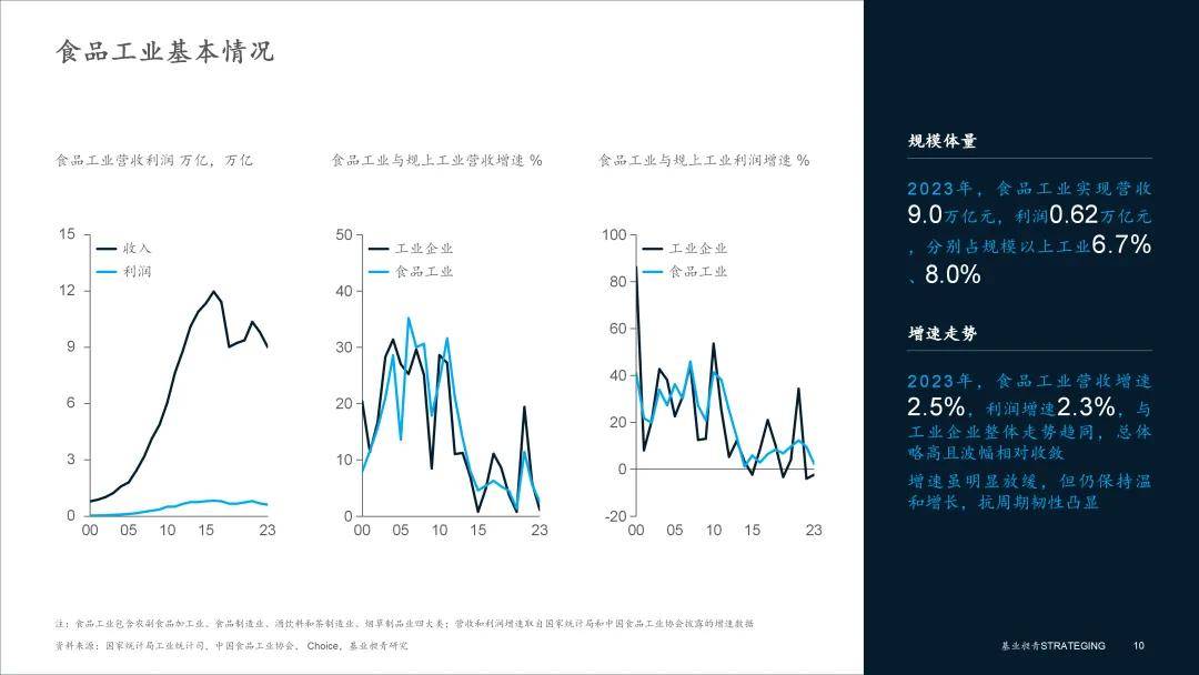 跟着居平易近食物类消费增加,食物工业规模不竭扩大。从规模体量上,2023年,食物工业(含农副食物加工业、食物制制业、酒饮料和精制茶制制业、烟草成品业)实现营收9。0万亿元,别离占规模以上工业6。7%、8。0%。从增速走势上,2023年,食物工业营收增速2。5%,利润增速2。3%,取工业企业全体走势趋同,总体略高且波幅相对。全体看,食物工业做为国平易近经济的支柱财产和根本财产,行业经济效益增速虽较着放缓,但仍连结暖和增加,抗周期韧性凸显。
